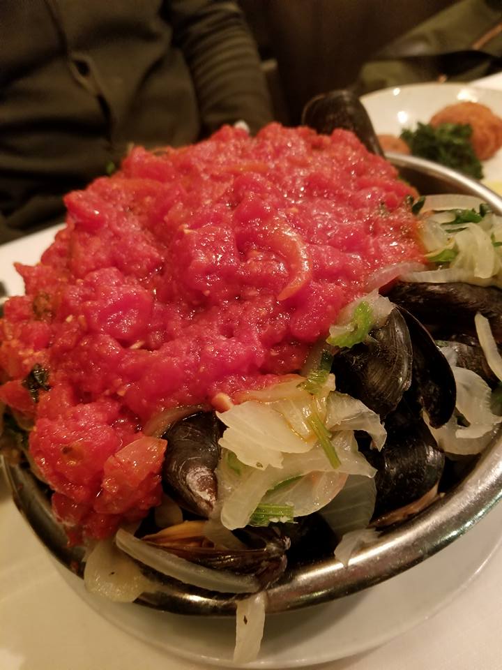 アントワープ在住の知人お勧めで、トマトがたっぷり乗ったムール貝を注文。